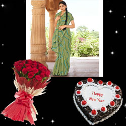 Fancy Silk Saree Seymore Kesaria -11376 + Yummy delicious Heart shape chocolate cake - 1kg + Beautiful Flower Bunch with...
