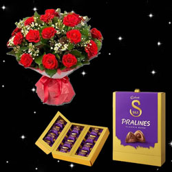 Beautiful Flower bunch with12 Red Roses and fillers wrapped with a decorative paper along with bow + Cadbury Dairy Milk ...