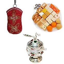 Silver Cow and Calf Idol , Weight : 13.5 gms + Designer HAND PURSE-9250 + 500gms of Assorted sweets NOTE: Same d...